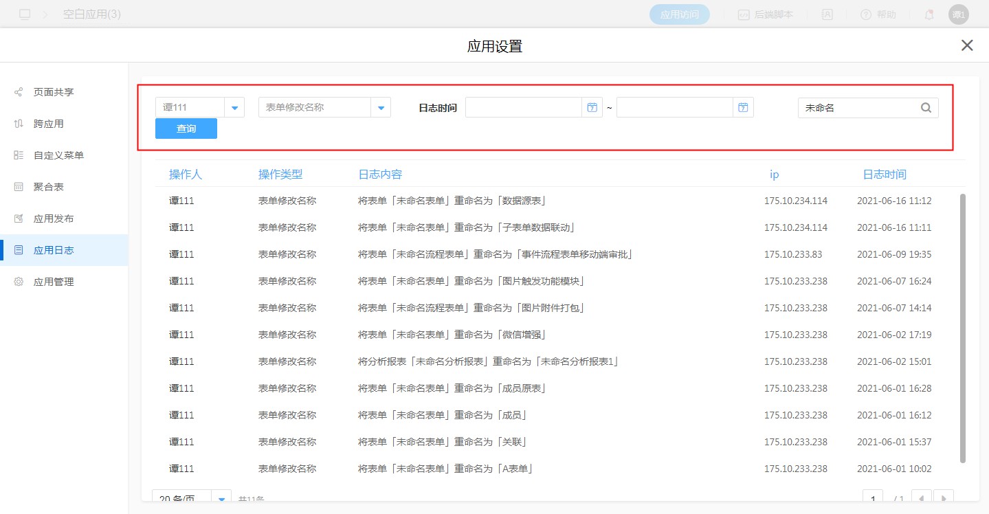 应用日志里展示了应用内的操作记录,如:表单创建记录、表单字段增添/删除、表单名称修改等等。