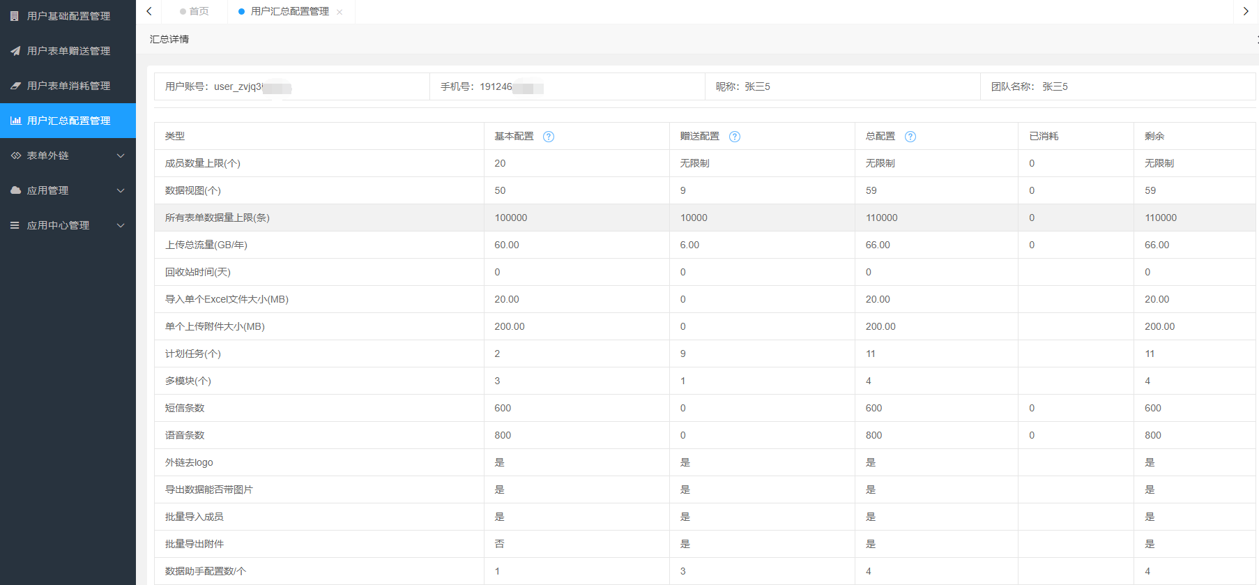 表单->用户基础配置管理中设置的值; - 赠送配置: 在