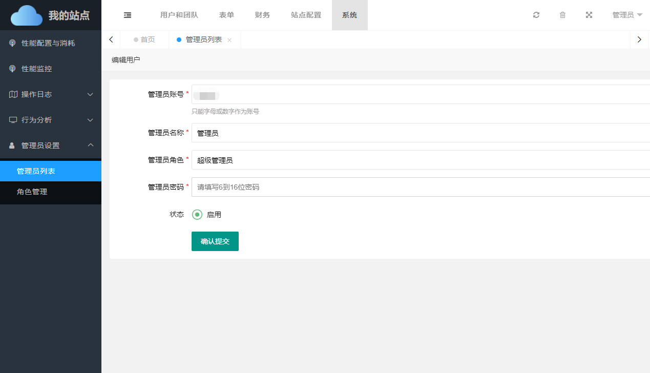 已存在的管理员可以进行编辑,编辑时,所有信息均可重新设置。