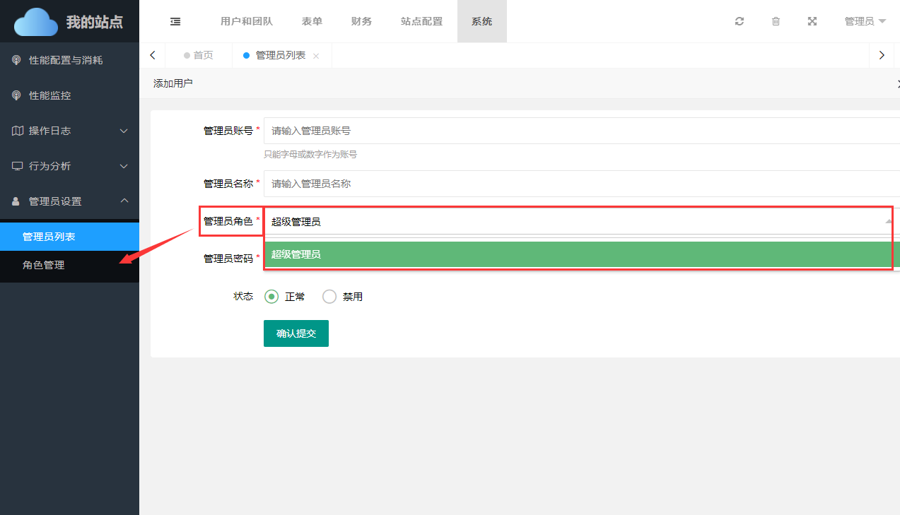 添加管理员时需要选择对应的管理员角色,如未设置过管理员角色,可在左侧角色管理中进行设置。