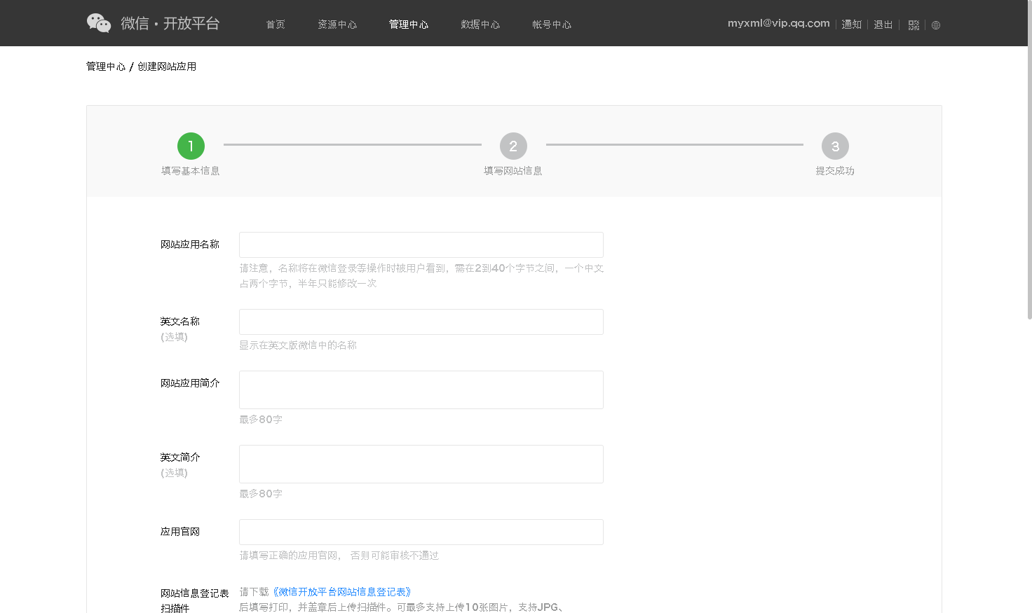 点击创建网站应用后,按照步骤输入应用信息