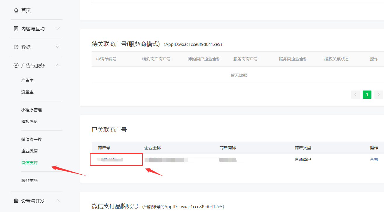 2.4、操作完成后,可以在微信公众平台->微信支付->商户号管理->已关联商户号,进行查看商户号(MCHID)