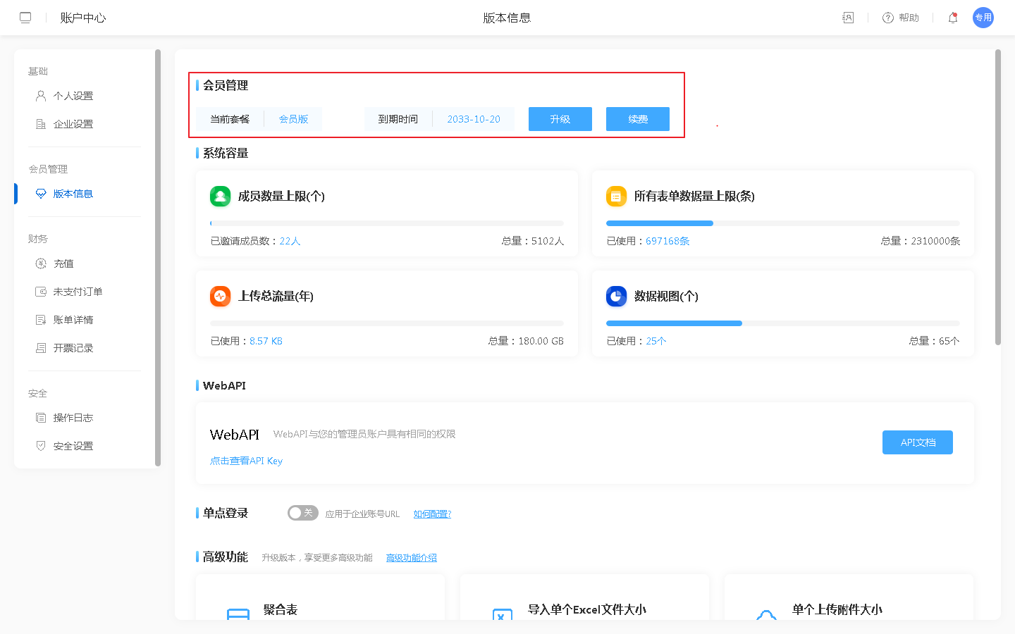 在版本信息中可以看到当前所使用的版本,并可以进行升级/续费操作。