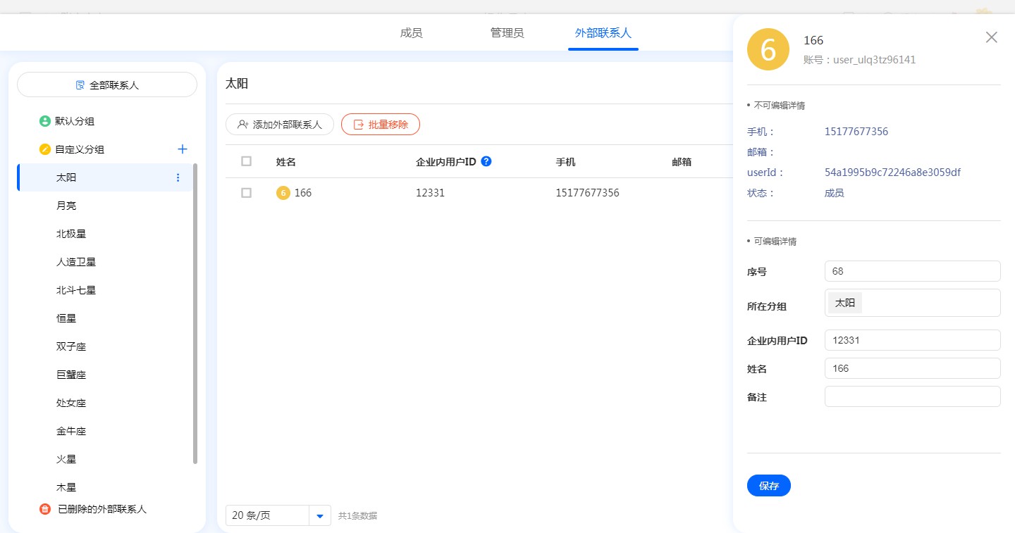支持对当前分组内的外部联系人,按姓名、手机、邮箱进行模糊搜索。