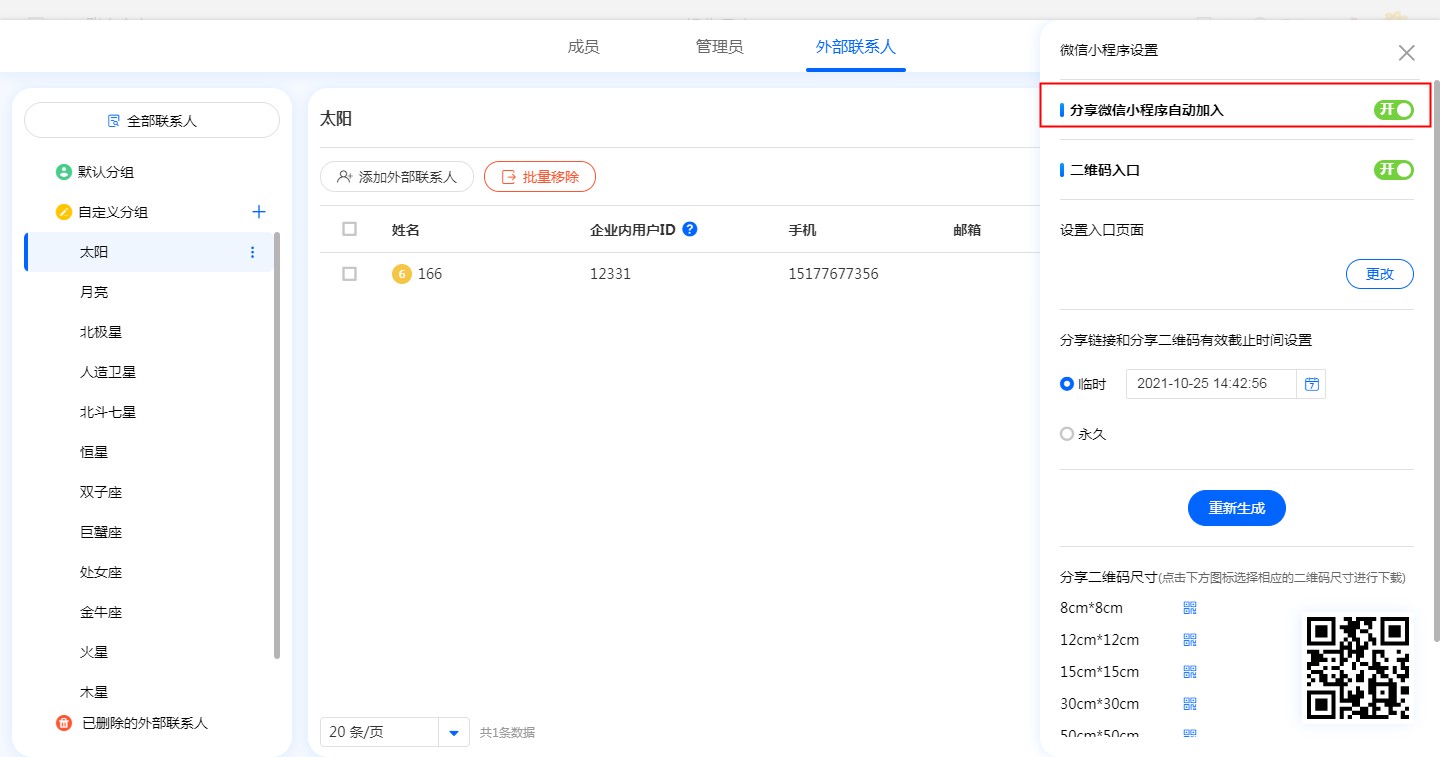 管理员在外部联系人-分组-小程序设置中,获取二维码,外部人员扫码此二维码即可加入团队,并加入该分组内。