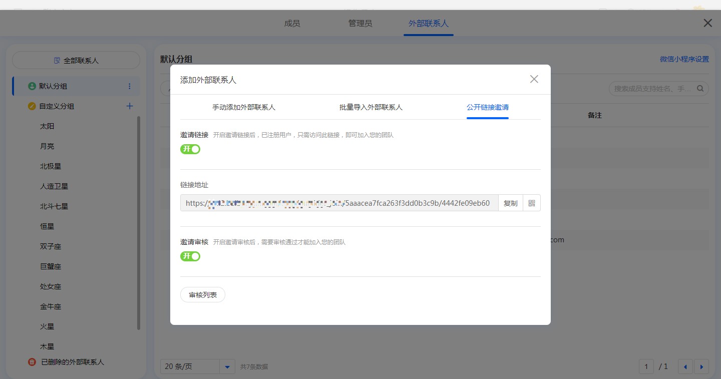 开启公开链接后,复制链接或二维码发送给外部联系人,外部联系人点击链接或扫码后均可加入团队。(注意:公开链接只能邀请已注册系统账号的成员)