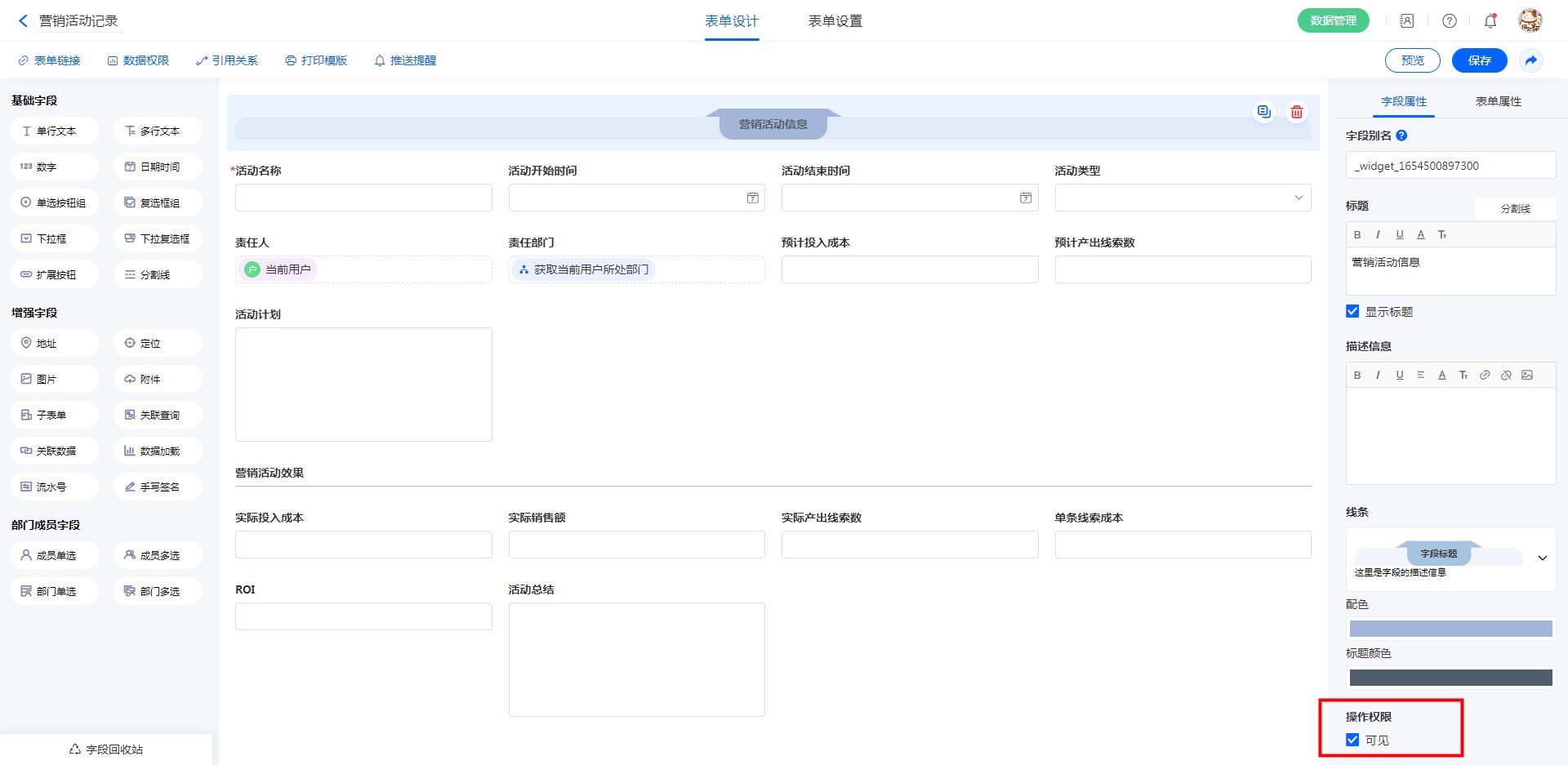 注意:流程表单字段的操作权限在“流程设置”-“节点属性”中定义,此处的设置无效。