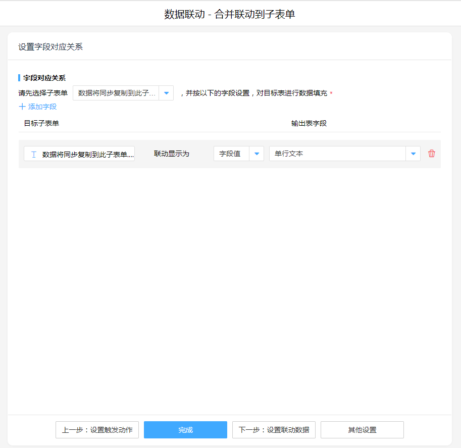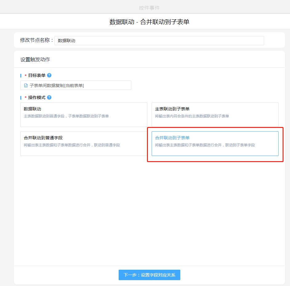1. 新增执行动作数据联动,操作模式选择:合并联动到子表单,字段对应关系中先选择子表单,再设置对应关系(只需要设置单个对应控件)。
