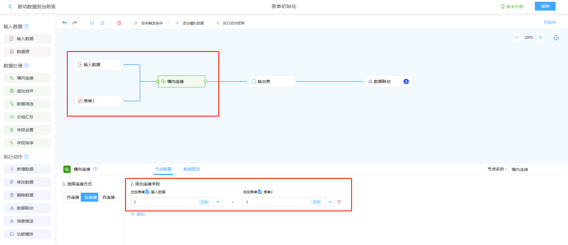 - 设置横向连接,讲表单2与表单3的关联字段作为连接条件。