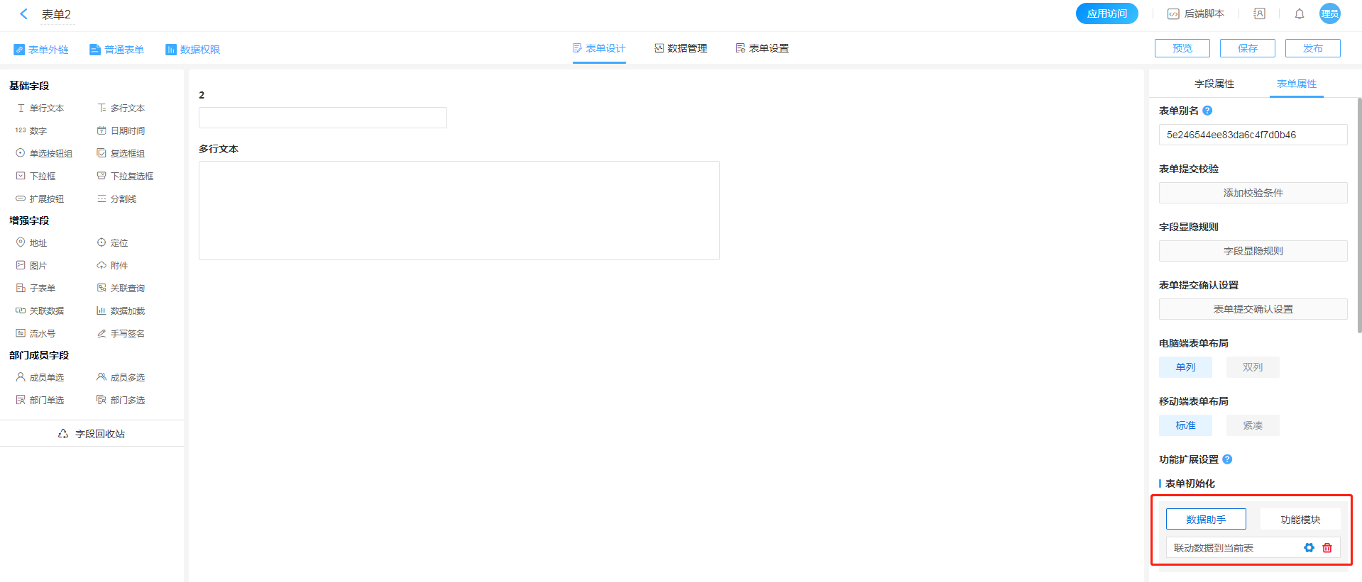 - 进入表单2的表单属性的表单初始化数据助手配置页面。