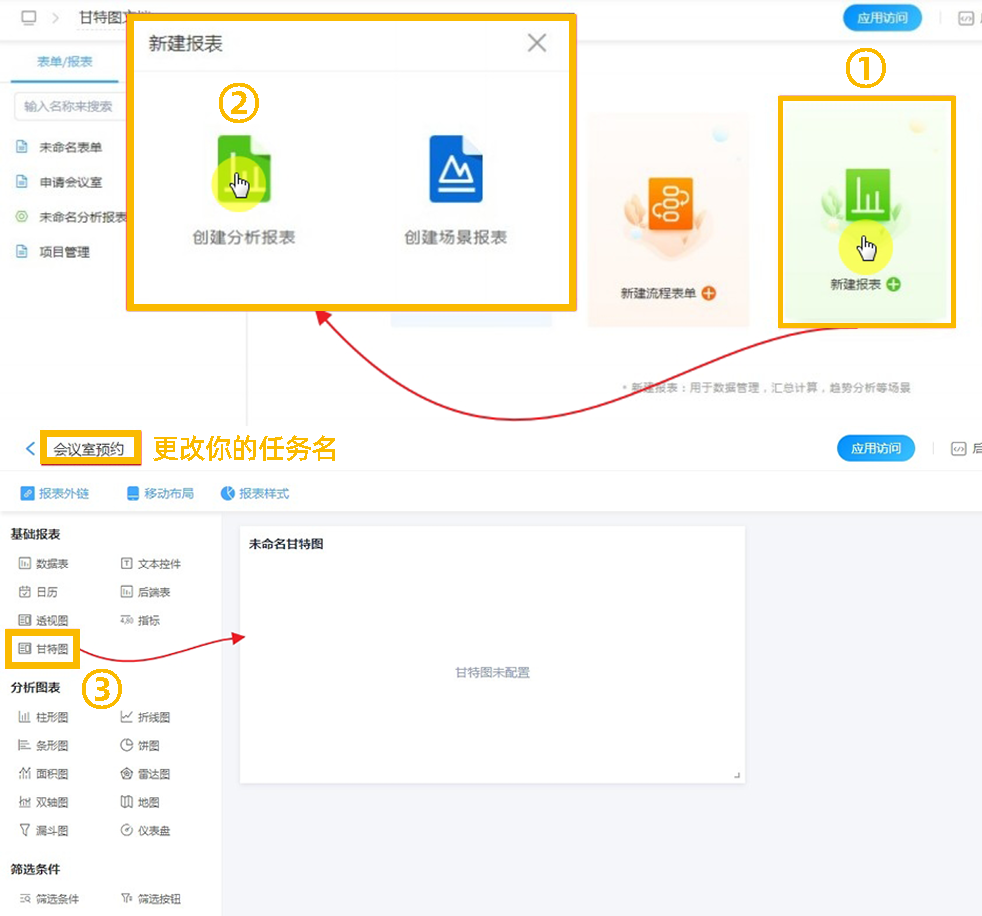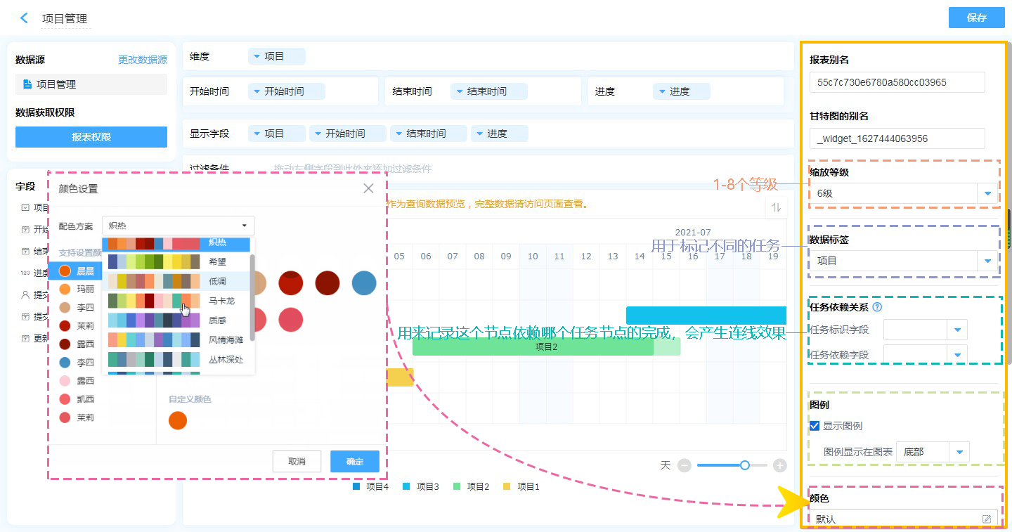 在分析报表组件中拖拽创建甘特图。