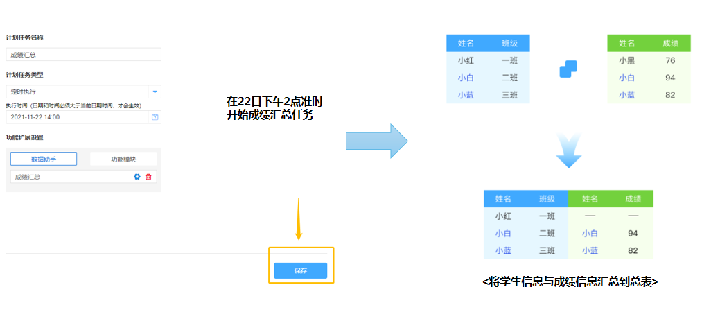 以家校管理中的学生成绩汇总为例,学生每个学期不同类型考试的成绩汇总,需要操作大量的数据表单,在工知云通过计划任务功能配合数据助手,能够有效为老师减负。