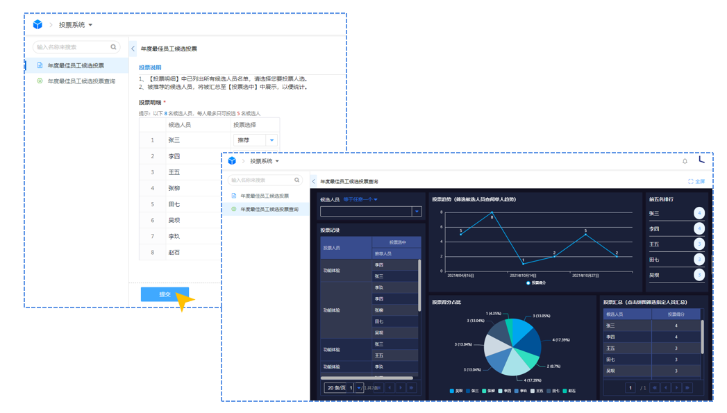 应用示例 1.评分系统——评分提交跳转评分汇总查询 提交评分意见后,将自动跳转到评分查询汇总表查看当前投票情况
