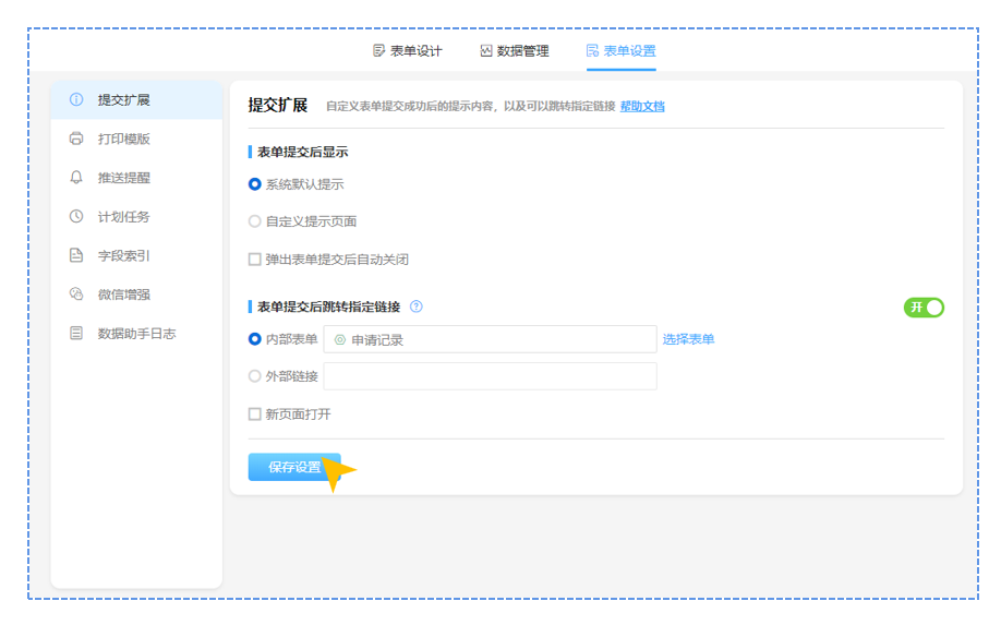 当跳转开启后,可以设置为内部表单/报表、以及外部链接,同时支持将当前消息表单的数据写入跳转的系统内部表单或报表中。