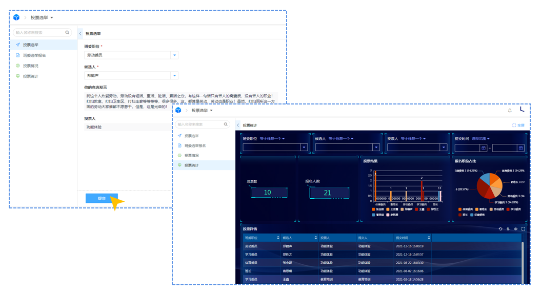 3.投票选举——投票选举跳转投票统计 在投票选举界面提交投票意见后将自动跳转投标统计表查看当前选举情况