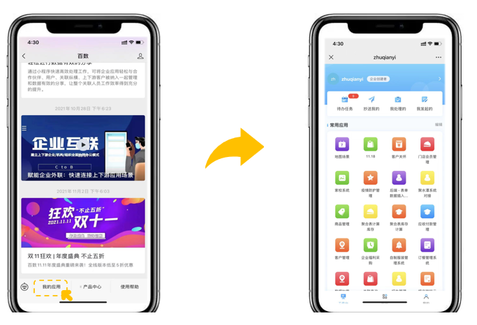 以工知云公众号为例,配置完成后,我们可以在移动端实现丰富的办公体验。在公众号的菜单栏点击我的应用即可进入到移动端工作台。