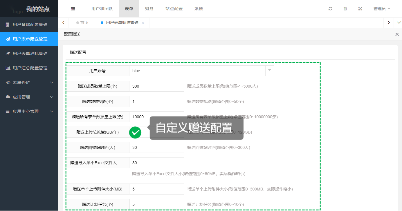 *时间段配置性能,适用于为团队管理员赠送配置 管理员登录后台—[表单]—[用户表单赠送管理]这个分类下,可以查看和管理所有用户的赠送和赠送记录情况。点击赠送选择需要赠送性能的用户账号进行自定义配置,提交后该用户账号在自定义赠送的时间期限内使用配置的性能,一般用于年费的控制,适用于商务版多团队型。