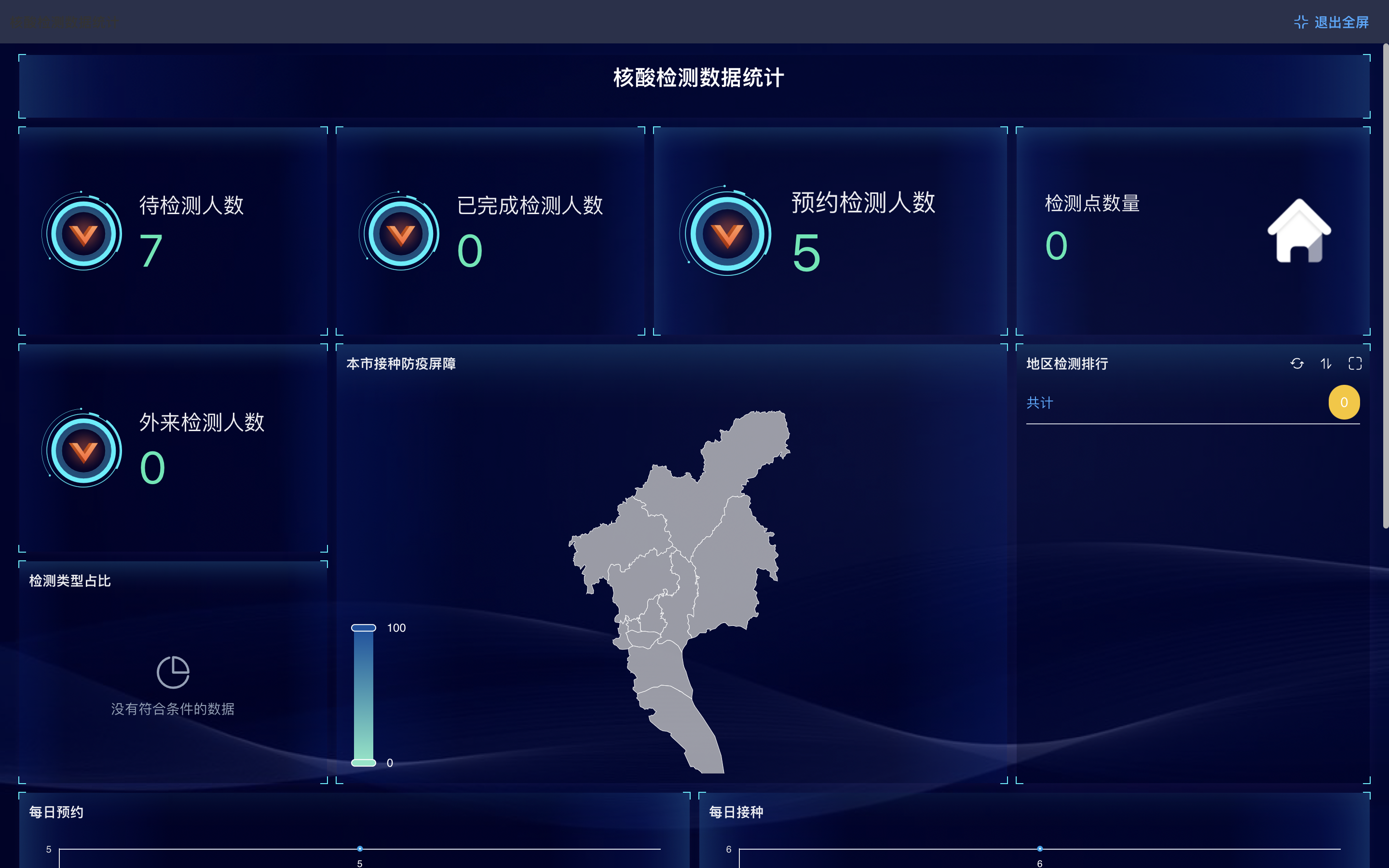 对于区域性核酸检测的人员数据进行报表的系统展示,通过曲线图来展示每日检测率,饼图各区域检测率及总检测人员的占比率。