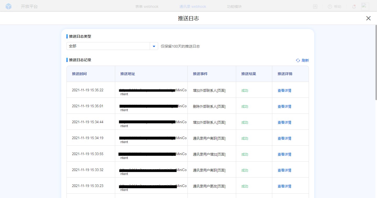通讯录页面操作、功能插件、后端、开放平台接口等方式更新通讯录均会触发通讯录webhook推送。