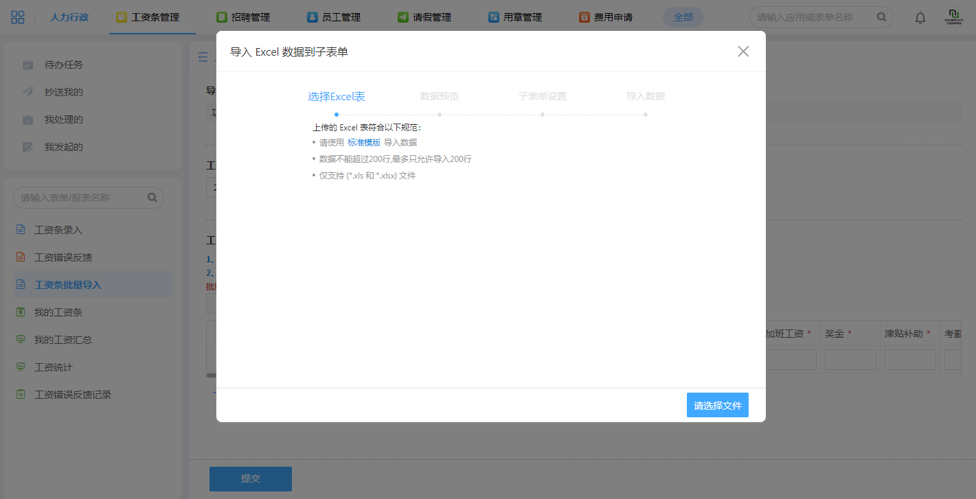 工资条明细录入除了单条手动录入外,支持excel表格的批量导入,且已有的工资条信息能自动覆盖更新。