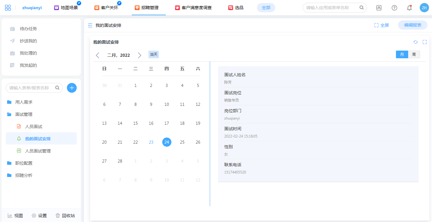 日历形式呈现面试安排,方便hr确认每日工作事宜,提前通知面试相关人员和预留会议室。