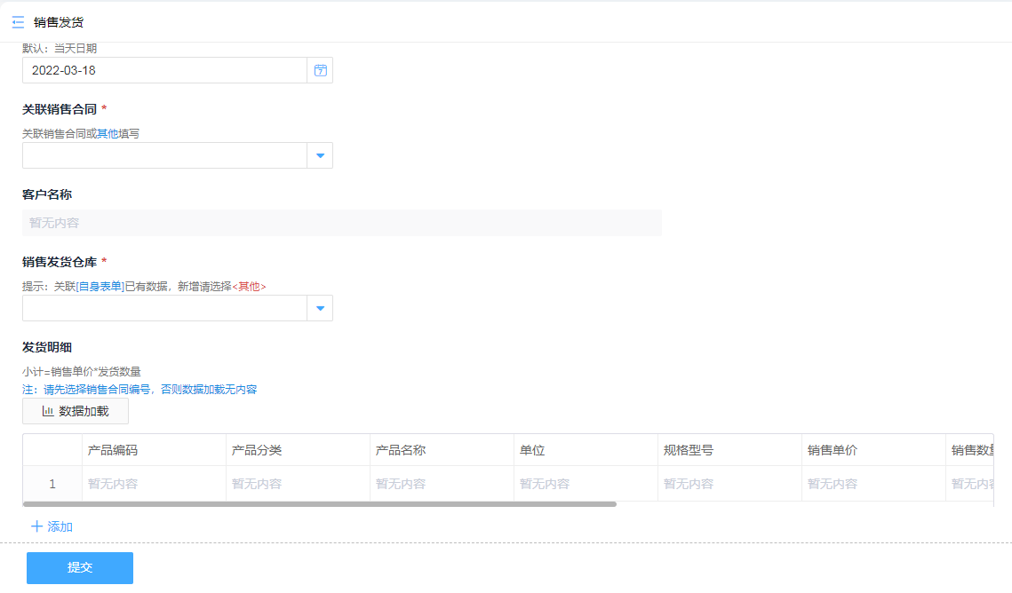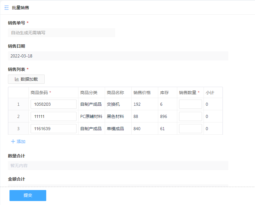 提交销售订单,借助数据加载链接商品库存可以直接生成商品信息列表,库存数量实时计算,当销售数量超过库存时将不能完成下单。