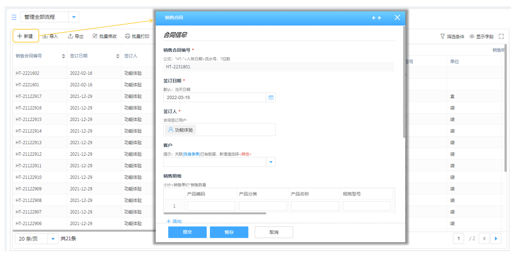 合同管理列表支持一键新建销售合同,提交后自动汇总到列表中。