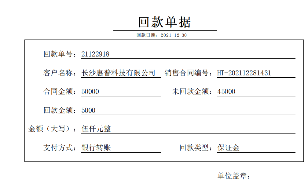 3.回款单 用于记录进销存回款金额与展示,并提供相关回款单打印模板。