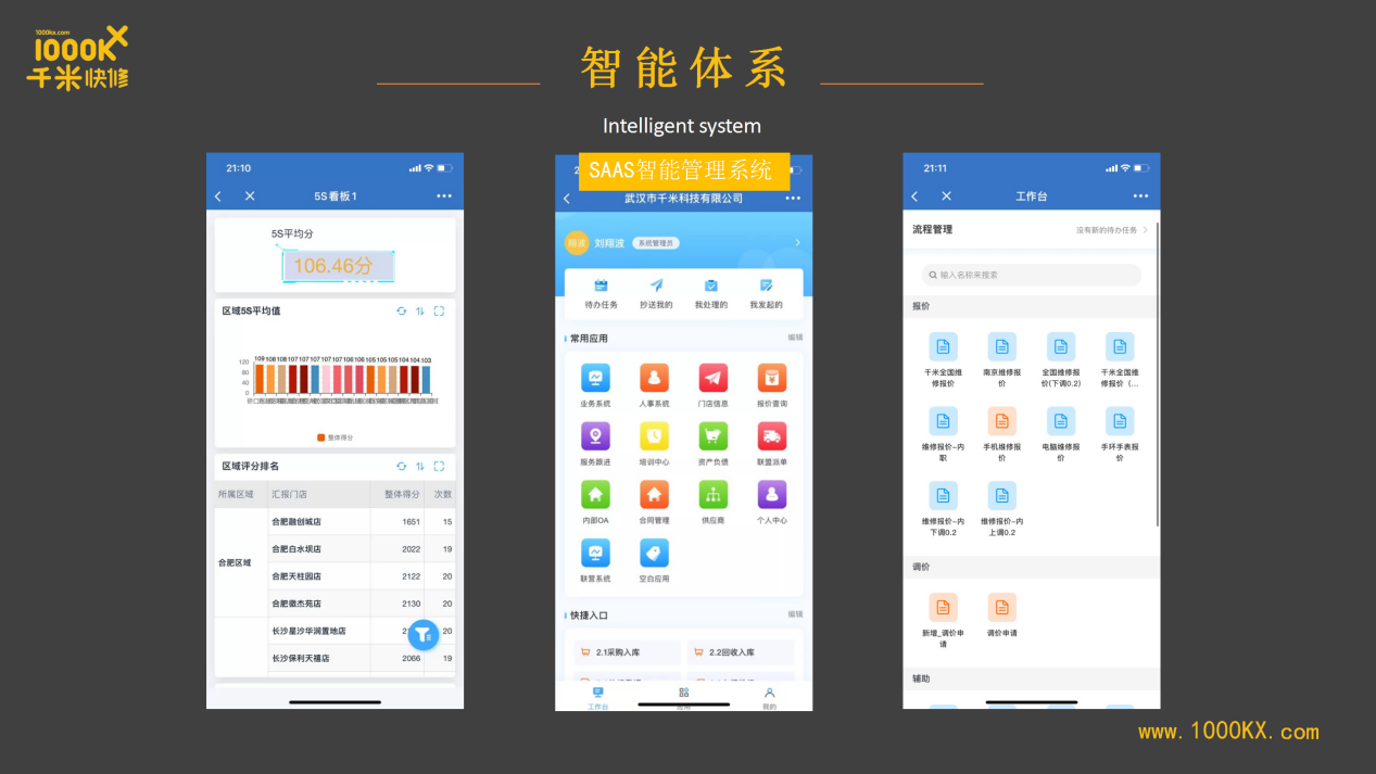 千米快修选择工知云搭建SaaS智能管理系统,从人、钱、事、物四个维度进行应用开发配置,实现包括门店员、财务、销售、库存等多板块智能管控。