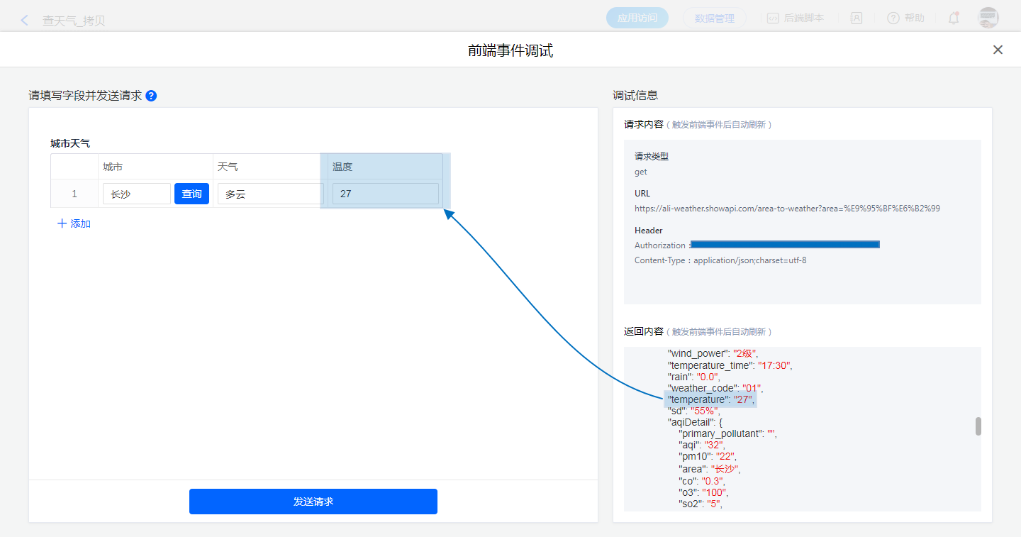 以下图中的天气查询为例,城市字段为触发字段,当输入城市之后,将会自动触发前端事件查询天气并返回天气值写入子表单同一行中对应的天气字段内。
