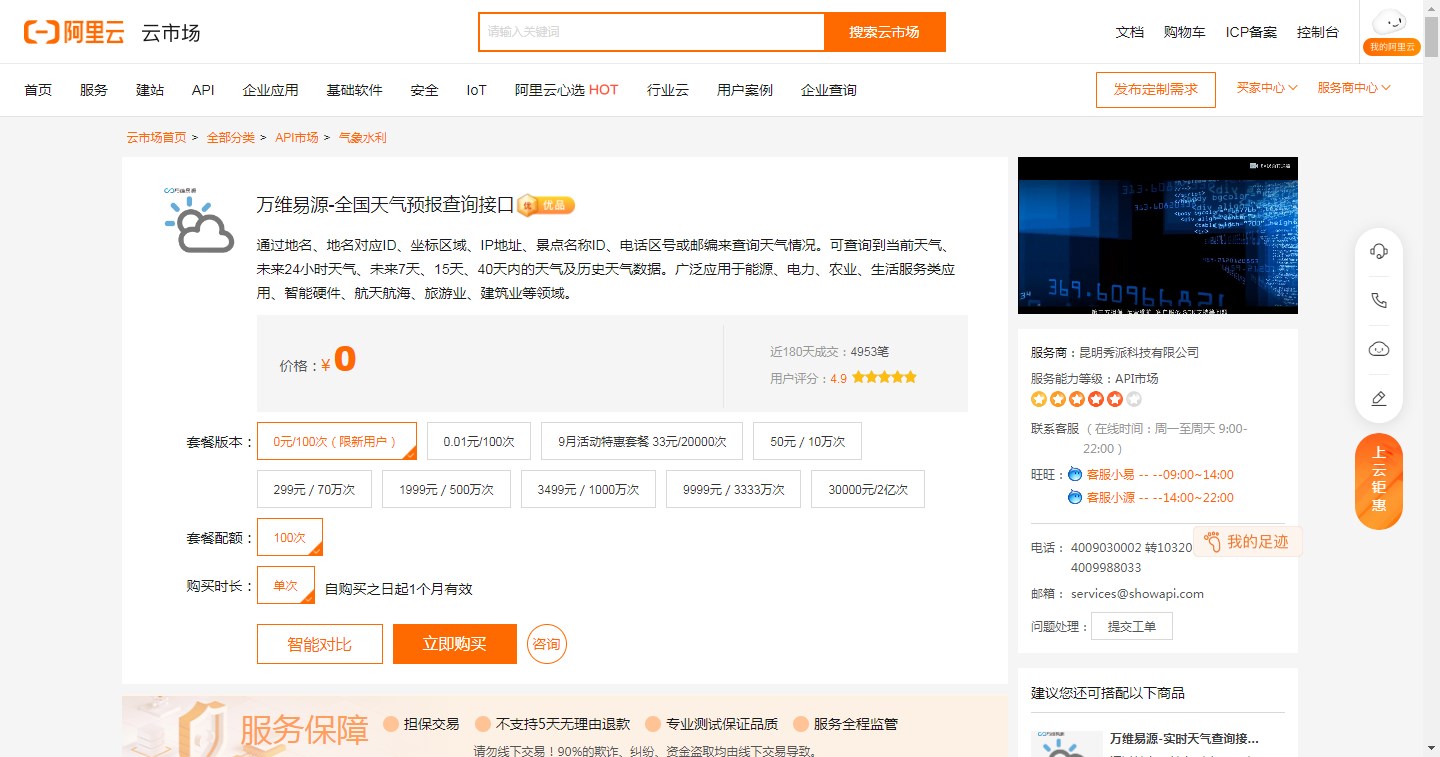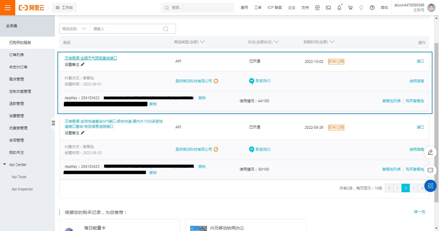 可以看到,此接口新用户可以0元购买100次,购买后可以在云市场看到购买的订单。