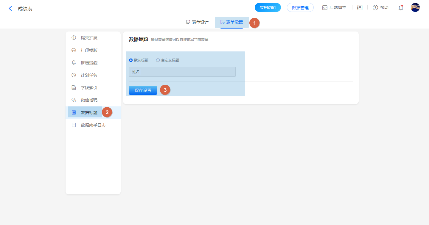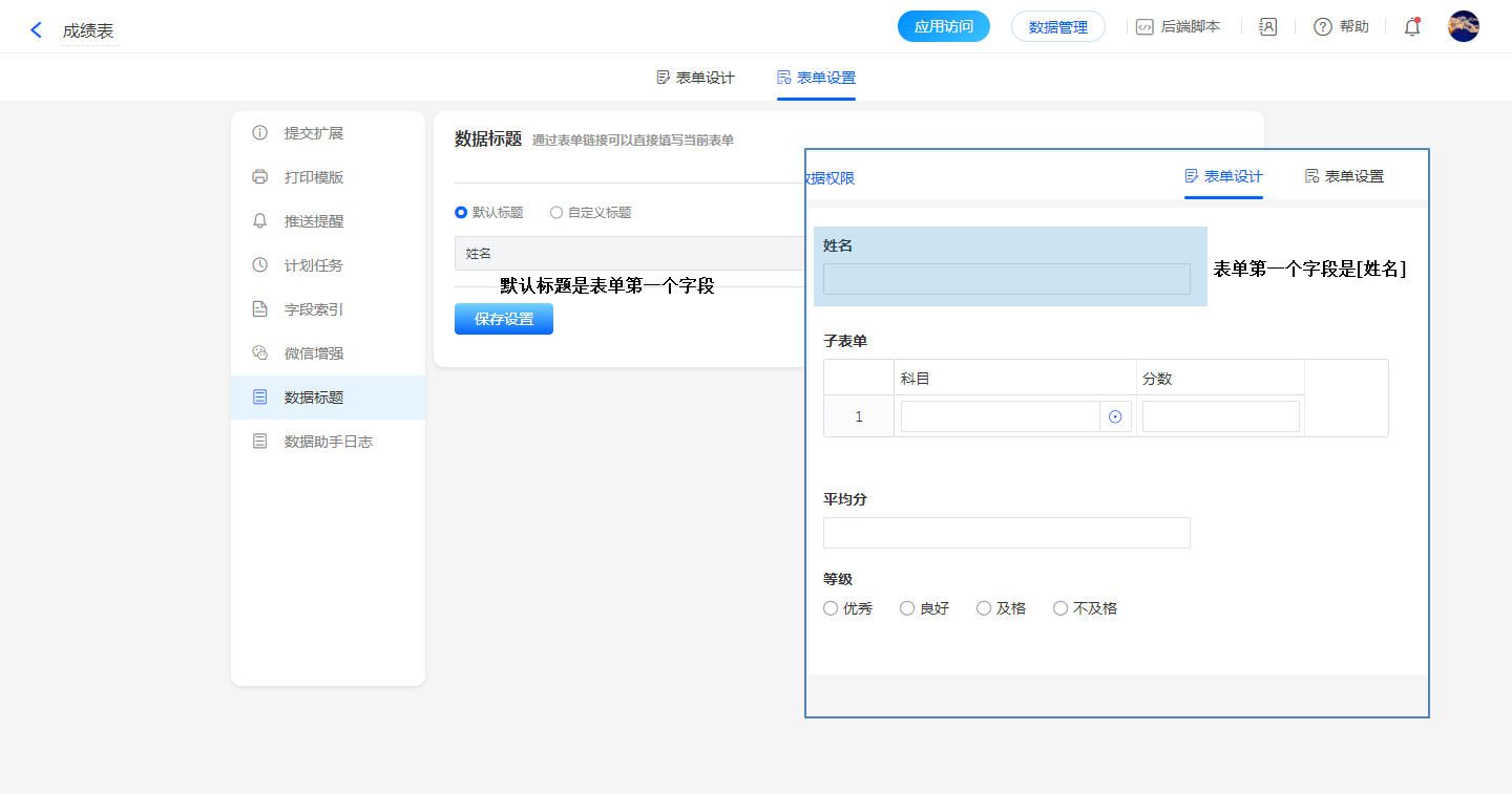如下图,成绩表单的第一个字段是[姓名],则默认标题是[姓名]。