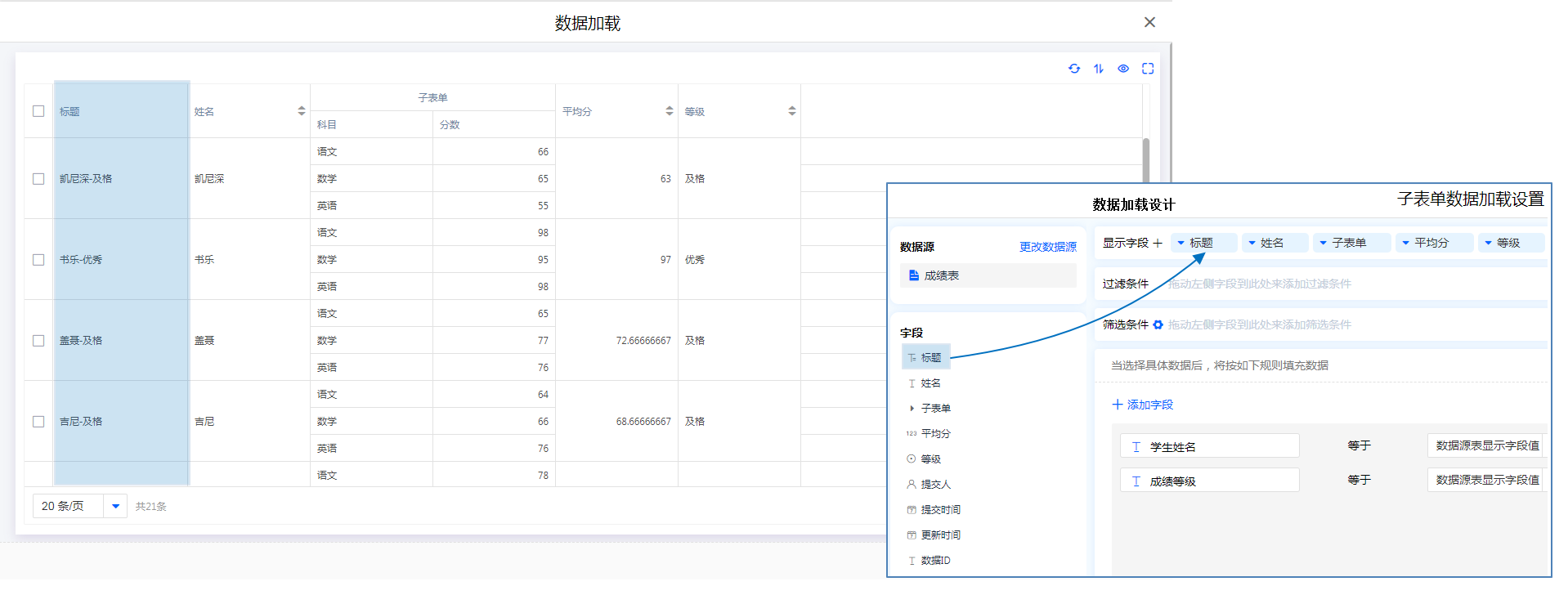 在设置关联查询或者关联数据字段时,显示字段可添加标题字段,在实际使用数据加载时,数据标题则会显示在关联查询或关联数据列表中。