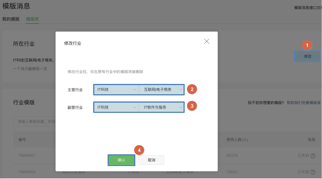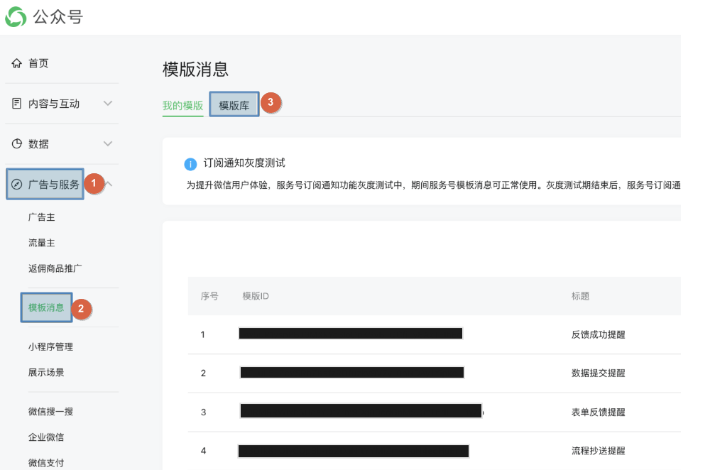- 后期平台站点公众号消息模板新增后,可以自动同步已集成的服务号的消息模板,无需手动配置。