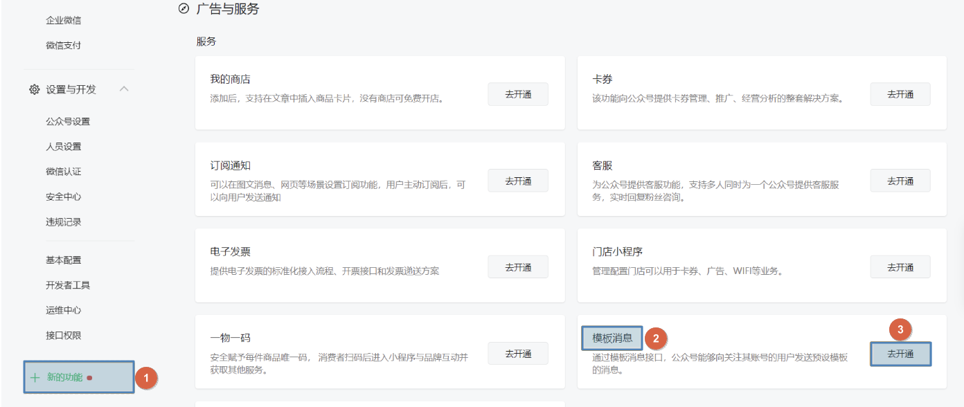 如果暂未开通 [模板消息] 功能,则需要先在 [新的功能] 中进行开通。如下图所示: