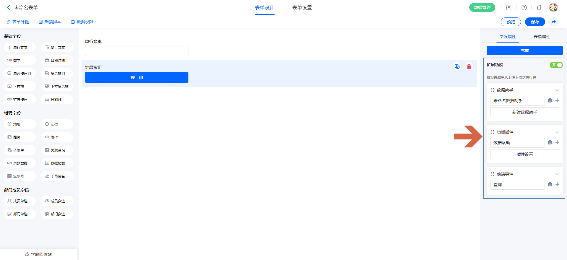 原来扩展体系只支持选择 [数据助手] 、[ 功能插件]、 [前端事件]、 [后端事件]中的一种进行设置,优化后支持这四种功能扩展同时设置,并行触发。