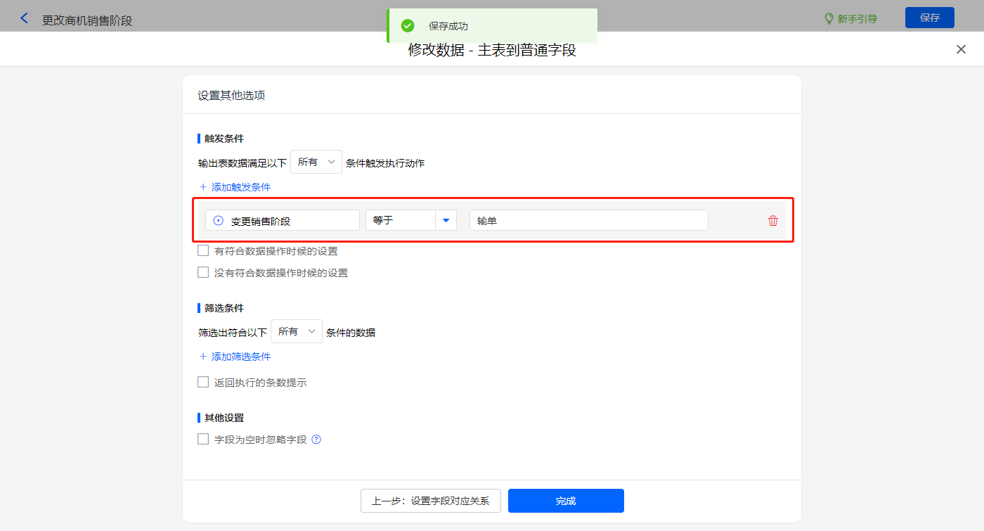 触发条件设置为当【变更销售阶段】字段不等于【赢单】,则修改主表【销售阶段】、【阶段变更时间】、【阶段类型】三个字段的值;