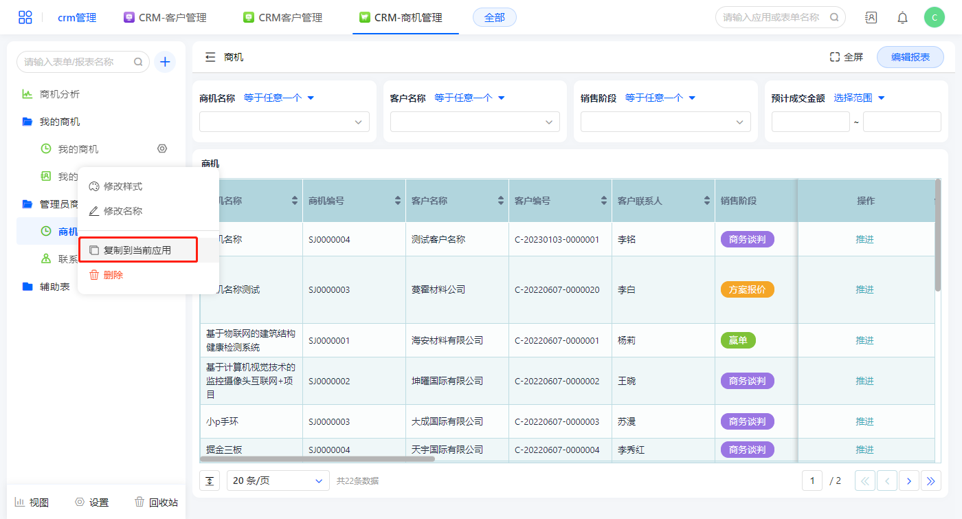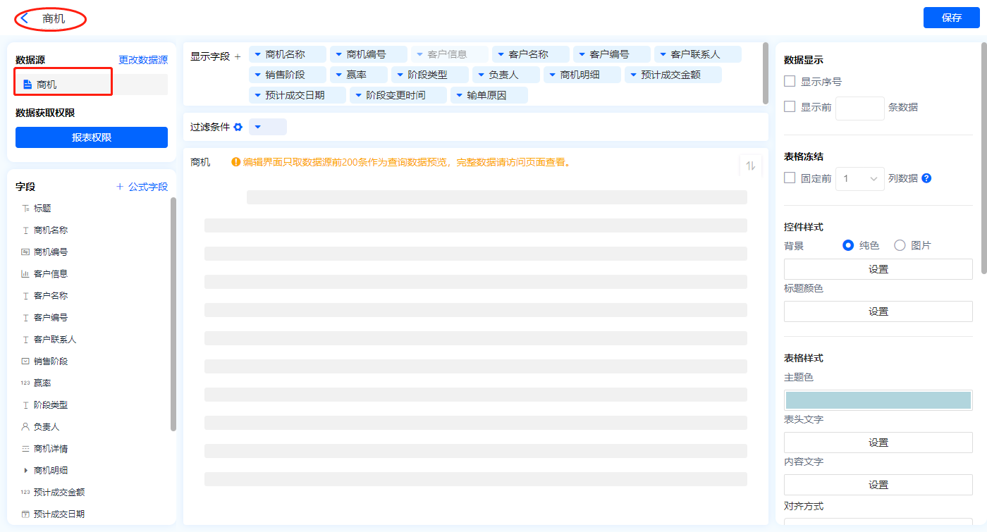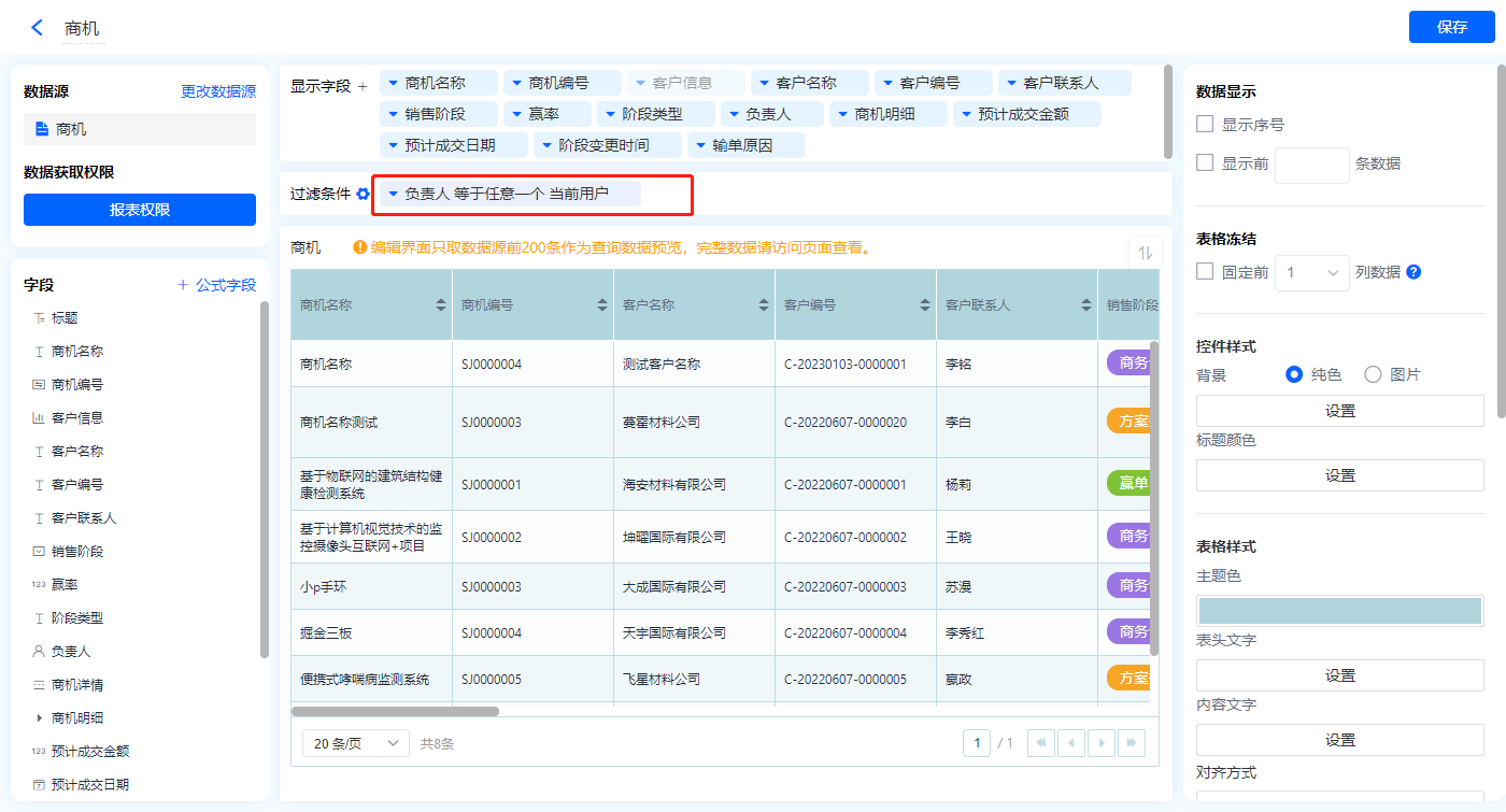 1)新增【我的商机】报表,用基础报表【数据表】展示数据源为主表【商机】的数据;