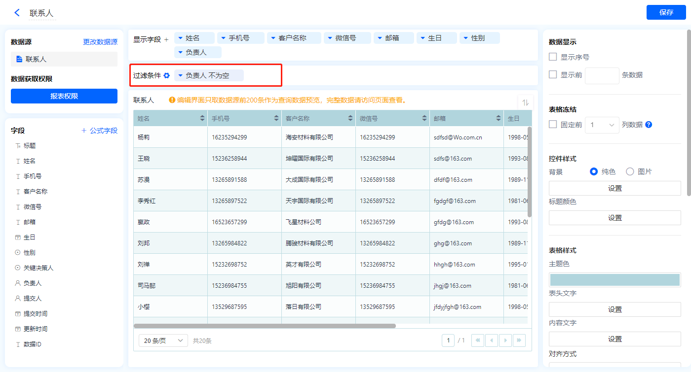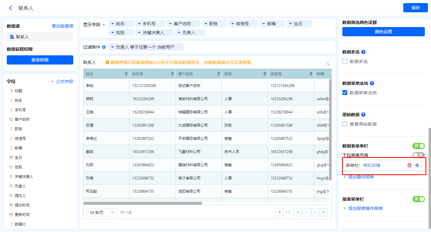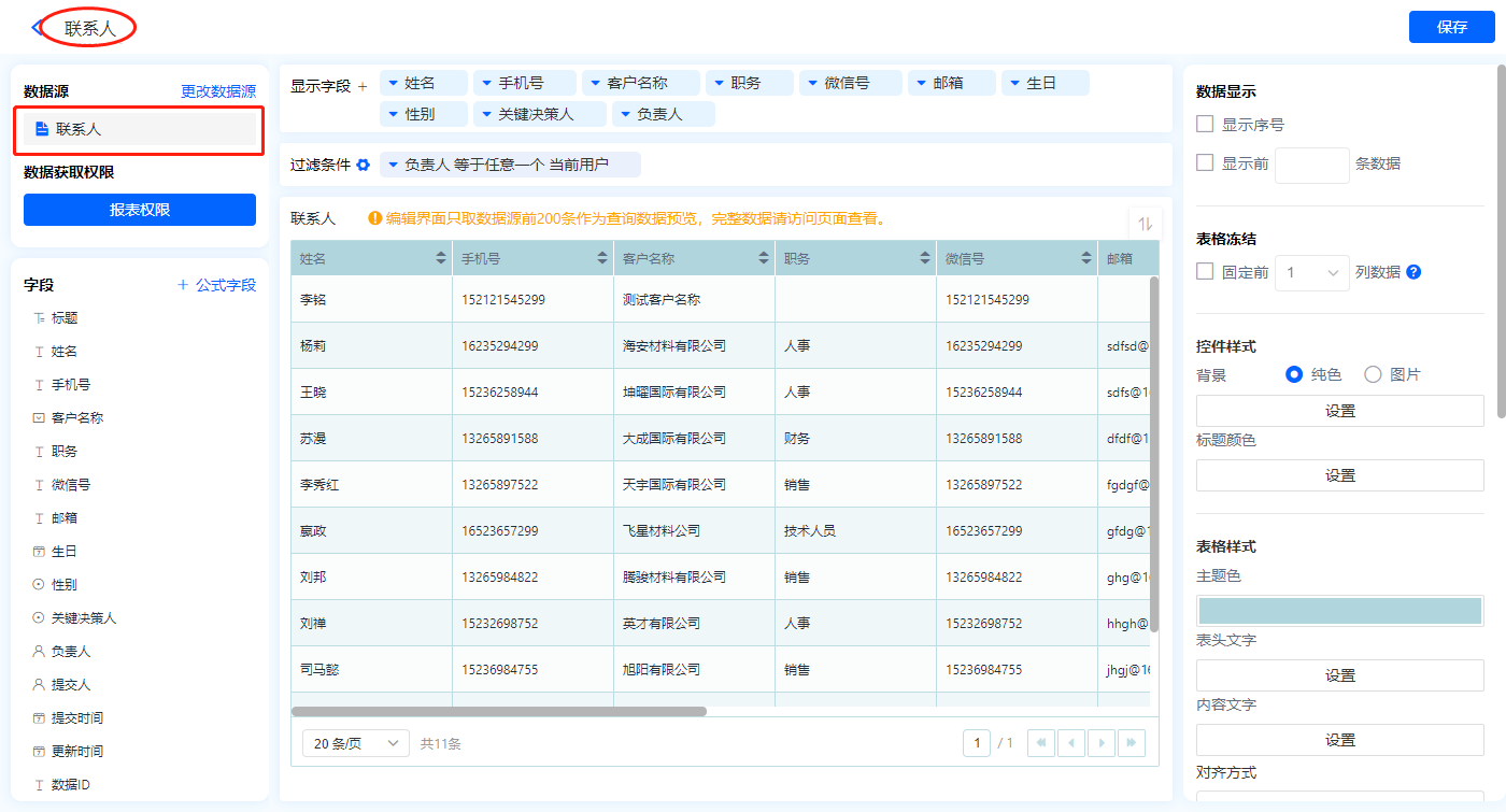 1)新增【我的联系人】报表,用基础报表【数据表】展示数据源为辅助表【联系人】的数据;