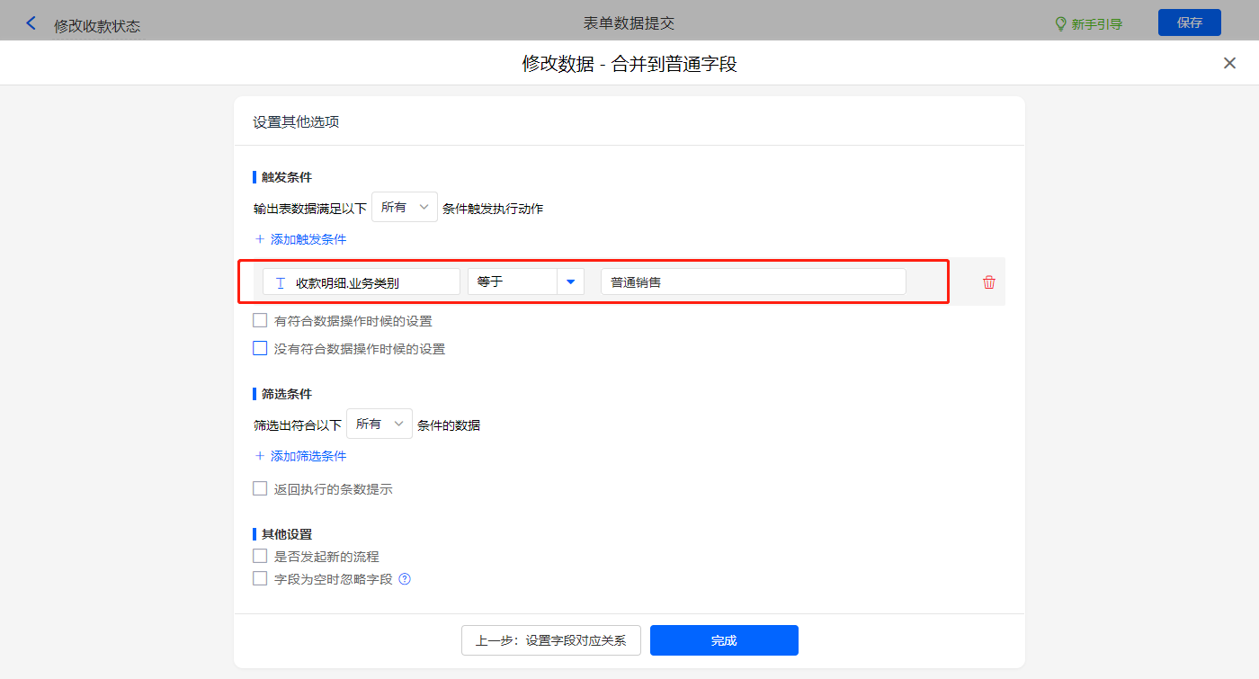 其他设置触发条件为【收款明细.业务类别】等于普通销售,设置好点击【完成】并保存该数据助手;