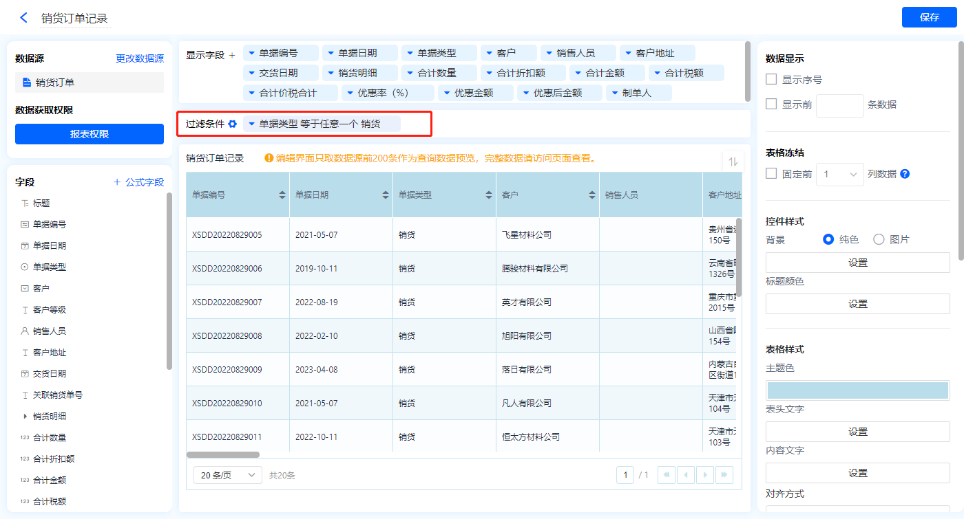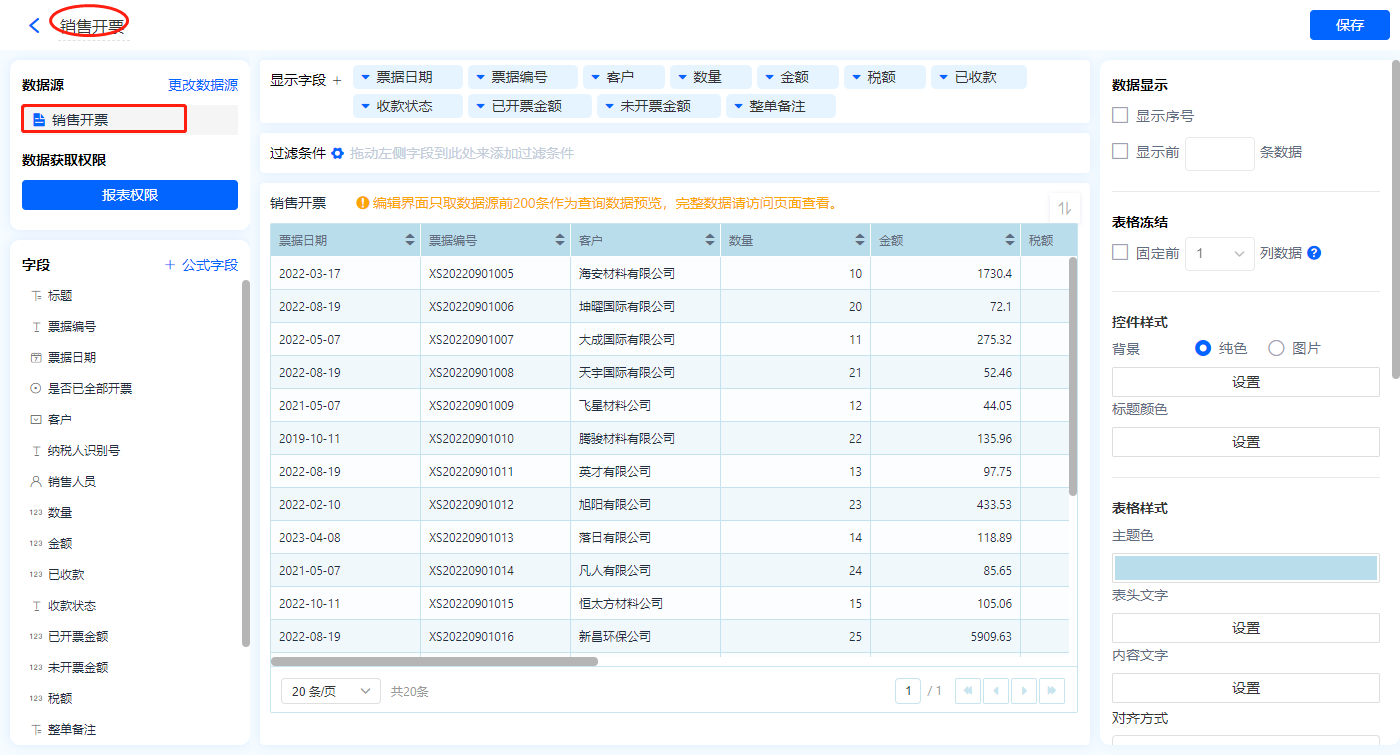 1)新增【销售开票】报表,用基础报表【数据表】展示数据源为表单【销售开票】的数据;