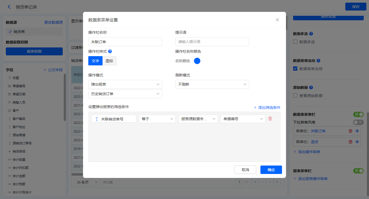 2)新增数据表菜单栏【关联订单号】、【退货】,配置如下;