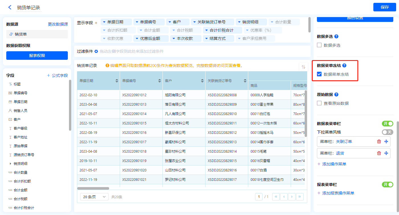 3)数据菜单冻结属性打钩,固定数据表菜单栏位置;