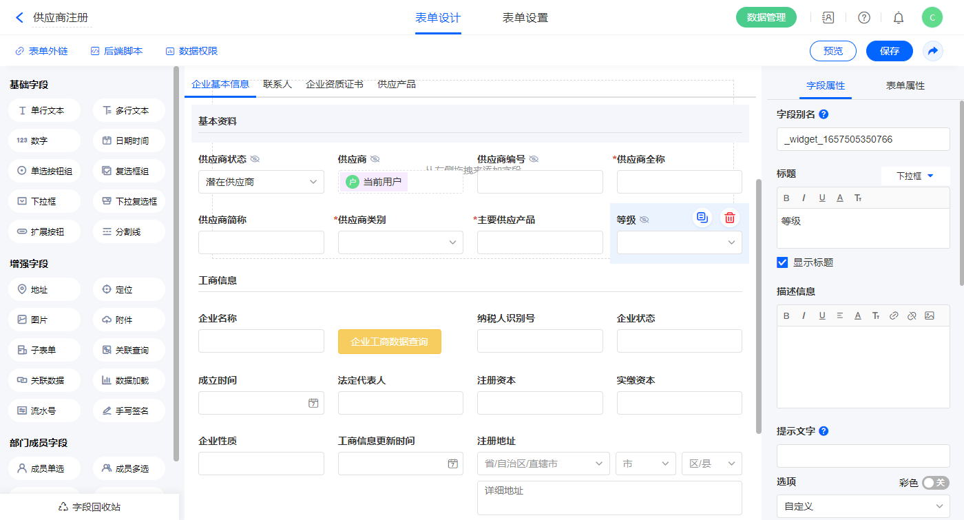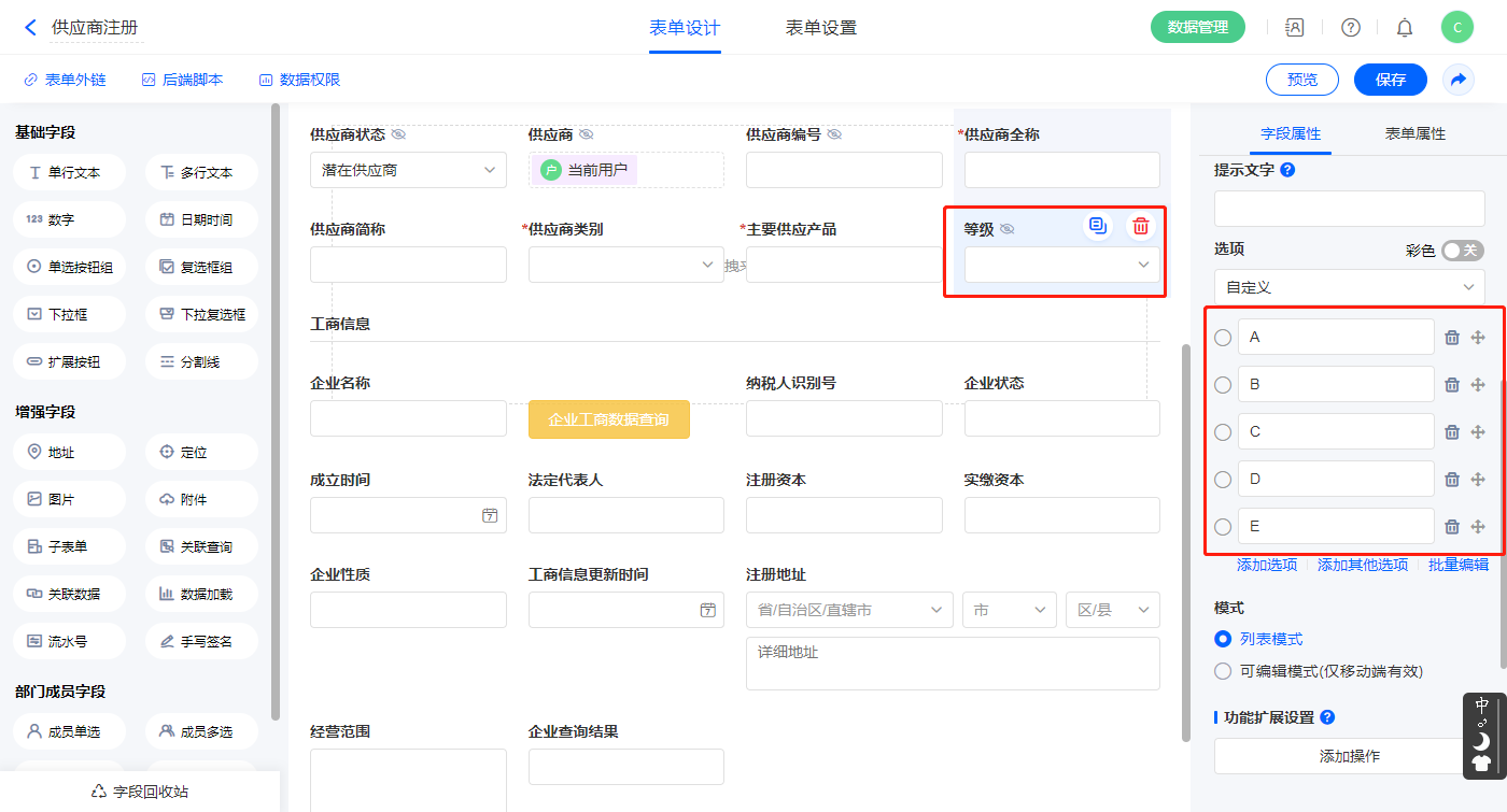 1)选中【等级】、【供应商状态】、【供应商类别】字段,输入下拉框选项;