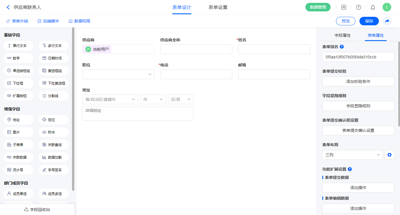 2.5、表单【供应商联系人】字段及表单属性设置