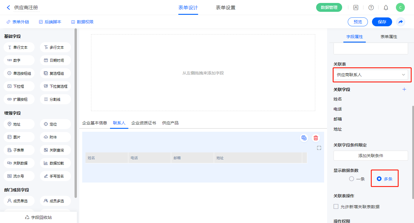 2)【供应商基本资料】关联查询字段,设置关联表为【供应商注册】并如图选择关联字段,设置显示数据条数为多条,并设置关联条件为【供应商】字段;