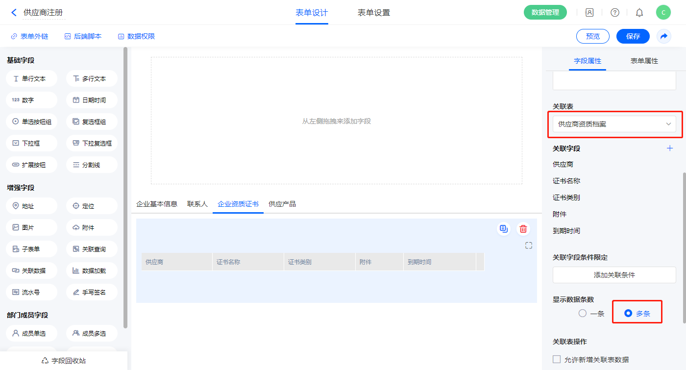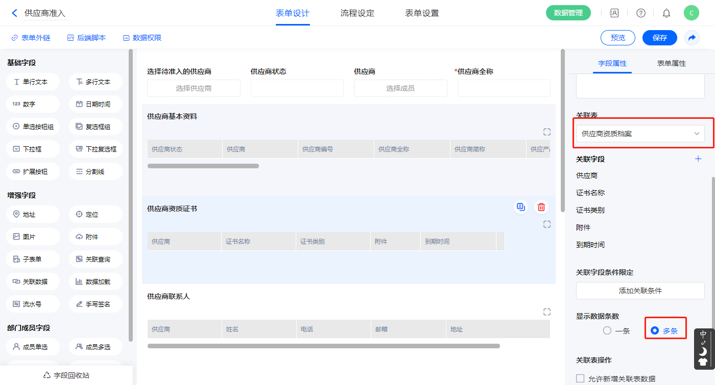 【企业资质证书】关联查询字段,设置关联表为【供应商资质档案】并如图选择关联字段,设置显示数据条数为多条,并设置关联条件为【供应商】字段;