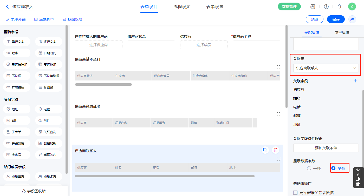 【供应商联系人】关联查询字段,设置关联表为【供应商联系人】并如图选择关联字段,设置显示数据条数为多条,并设置关联条件为【供应商】字段;