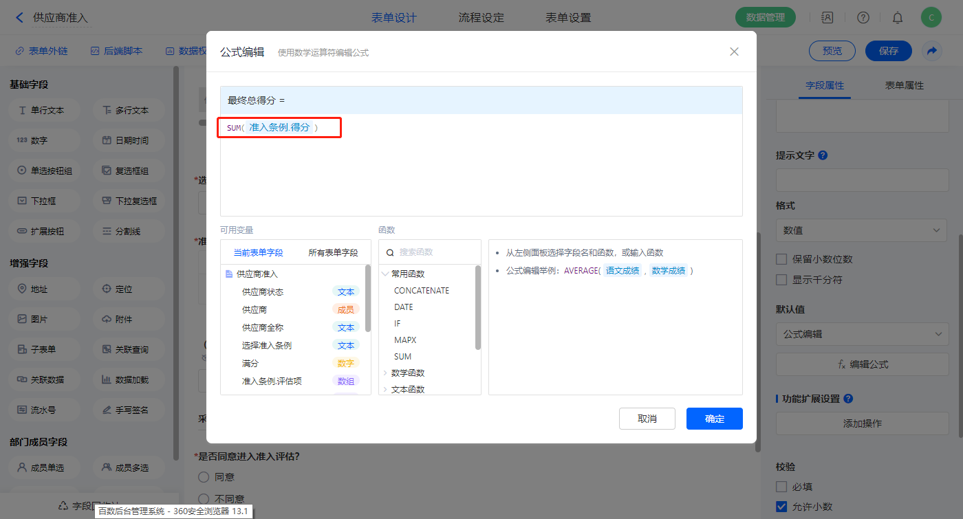 【最终总得分】字段,设置默认值为公式编辑,如图设置公式;