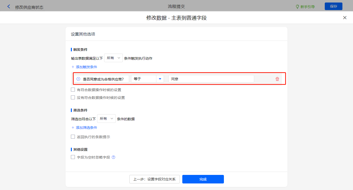 其他设置触发条件为【是否同意成为合格供应商?】字段等于同意,设置好点击【完成】并保存该数据助手;